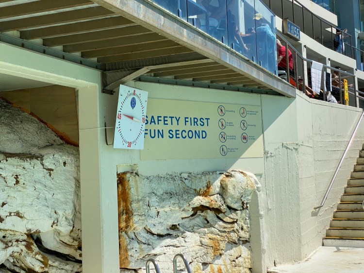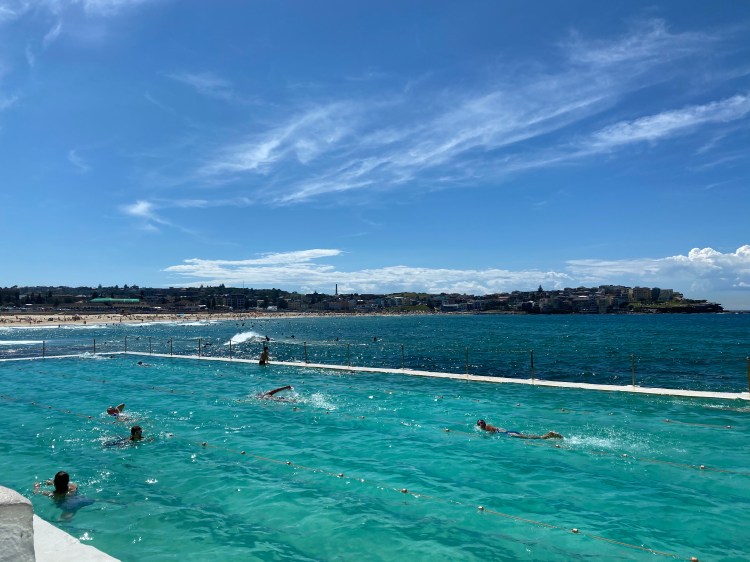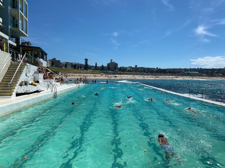 The Icebergs has a reputation of a place to lounge around in the sun to see and be seen, but it’s also definitely a place to swim. The salt makes it a pleasingly fast pool on a flat day, but at high tide with a bit of a wave on it can be a bit more challenging to stay in a straight line, or even stay in the pool…. When it’s too rough they put a rope across the western end of the pool at the 40m mark.